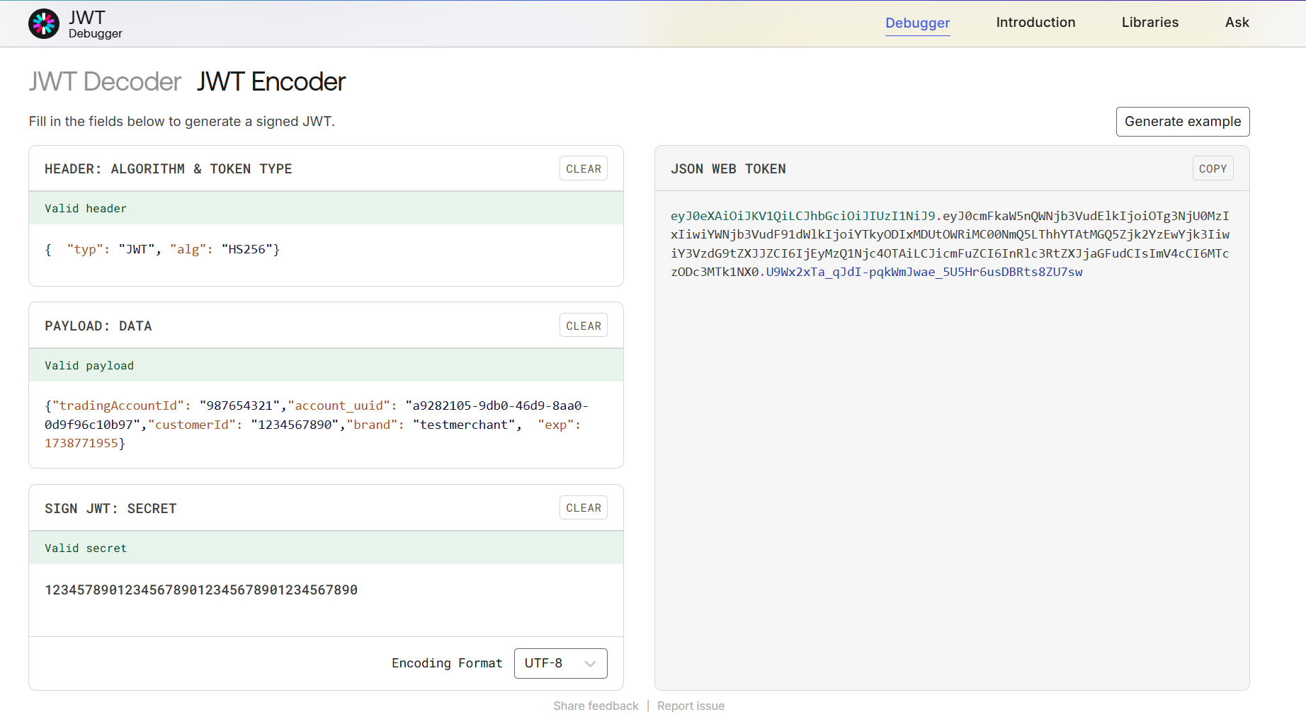 | PAYLOAD: | {"tradingAccountId": "987654321","account_uuid": "a9282105-9db0-46d9-8aa0-0d9f96c10b97","customerId": "1234567890","brand": "testmerchant", "exp": 1738771955} |