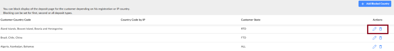 You can add countries to the blocked list and define the conditions under which users will be blocked from depositing.