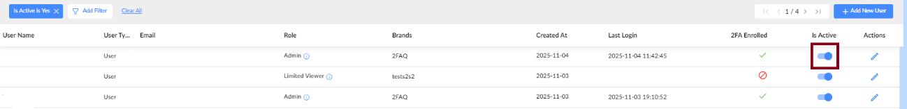 Click Add Filter at the top left to search for users by email, username, role, or brand.