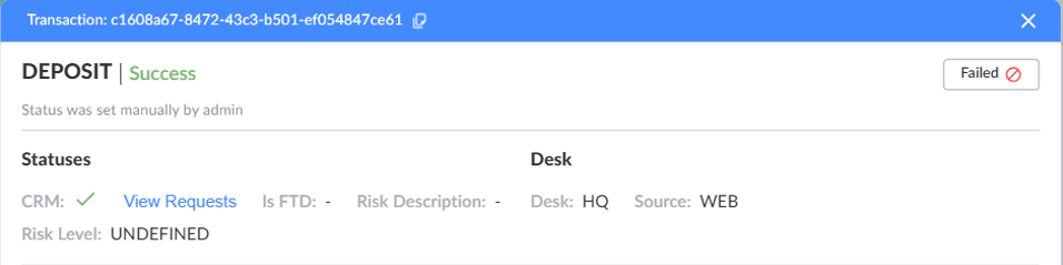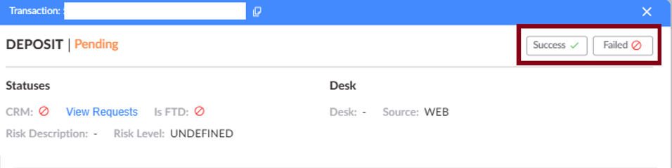 Click on a transaction record to open a popup with additional details. If the transaction status is "Pending," you can manually update it by clicking either the Success or Failed button.