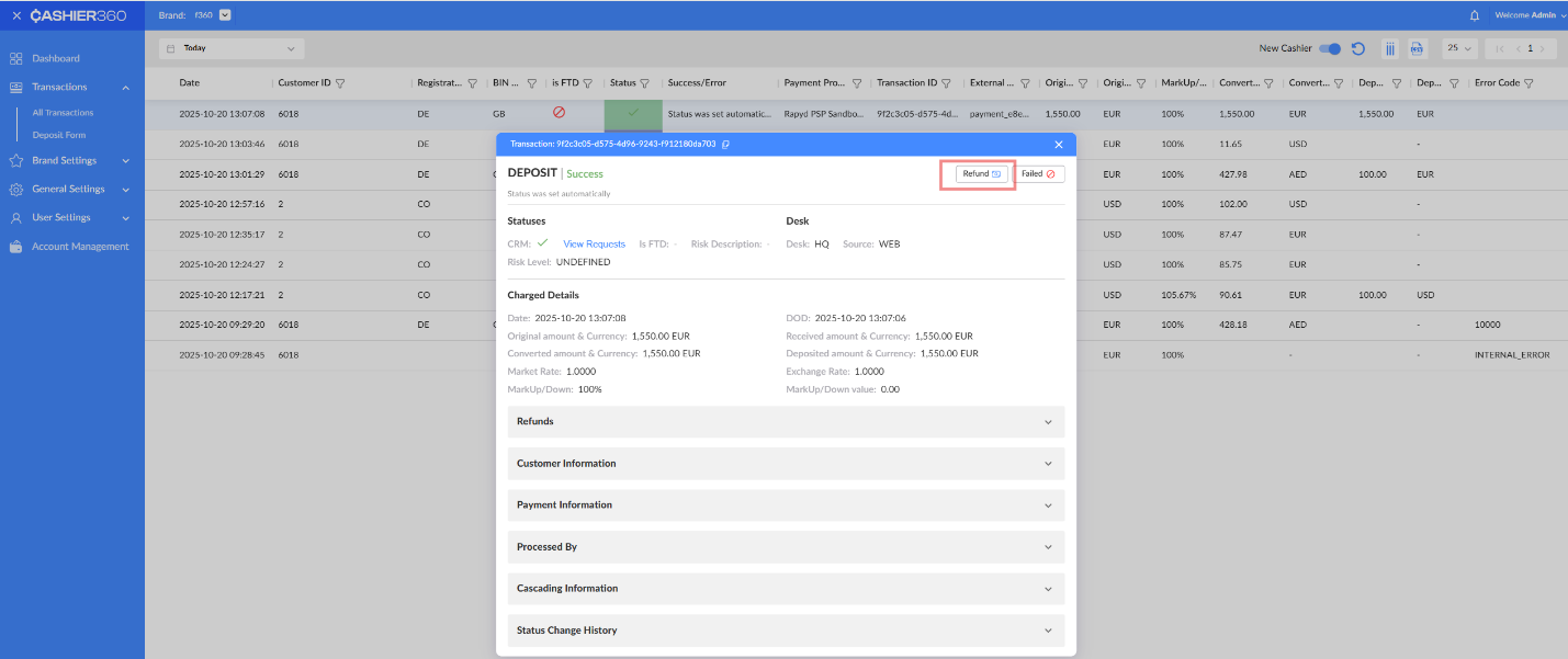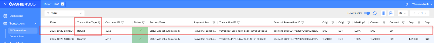 - All refunds appear in the transaction list, showing full details for each refunded transaction.