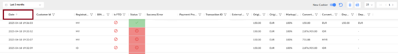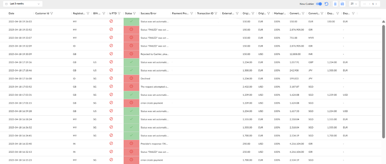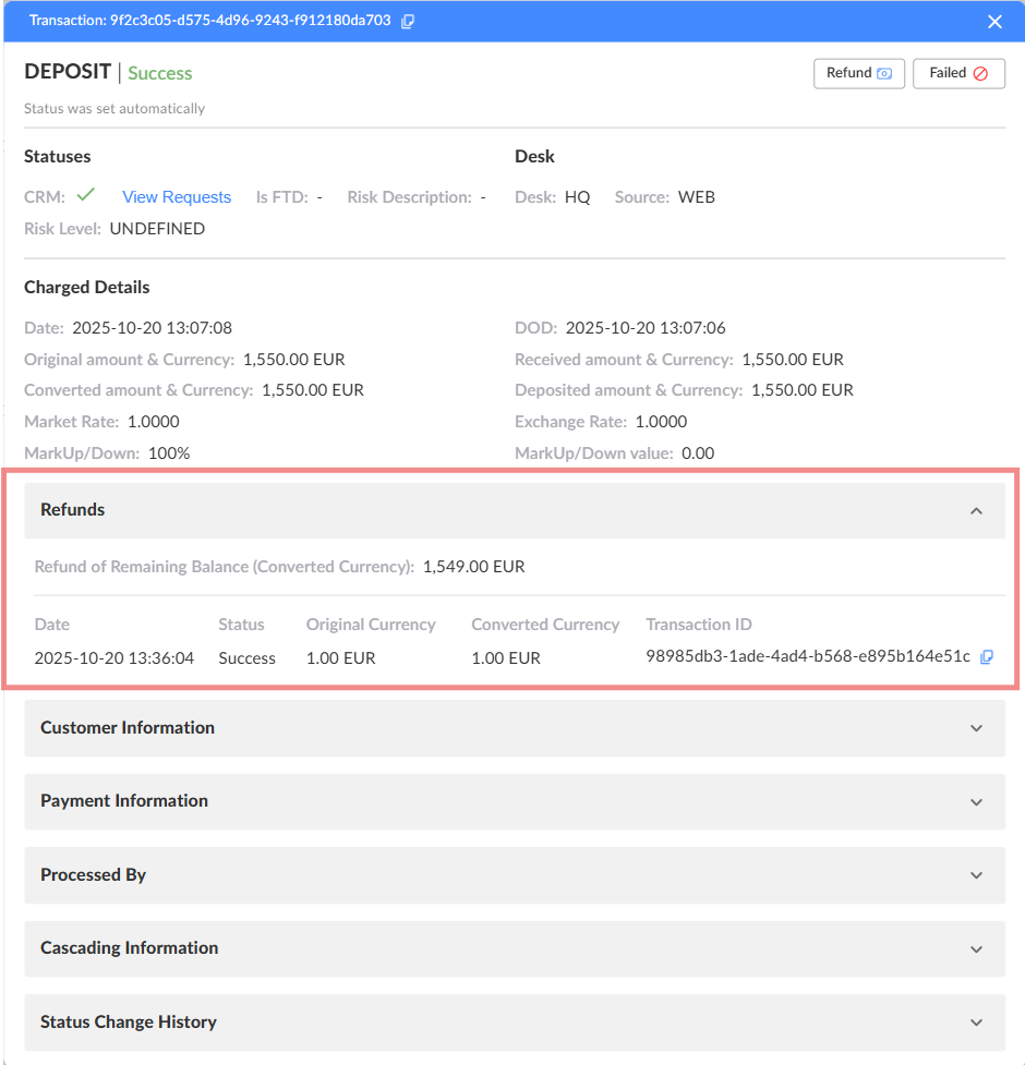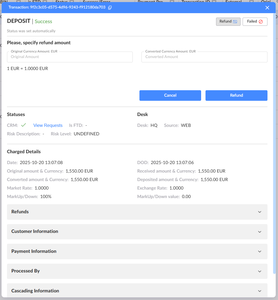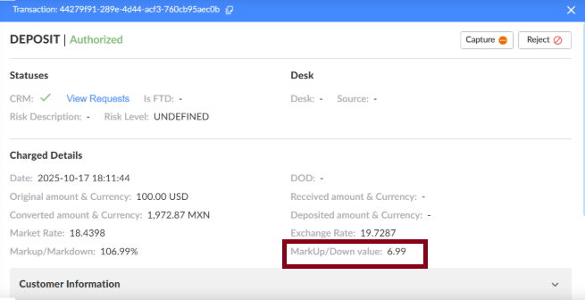 The MarkUp/Down value shows the absolute amount of markup or markdown in the original currency, calculated as (Original Amount × MarkUp/Down %) / 100 - Original Amount. It is available in the transaction grid (optional column), transaction card, CSV export (if enabled), and is also sent to CRM.
