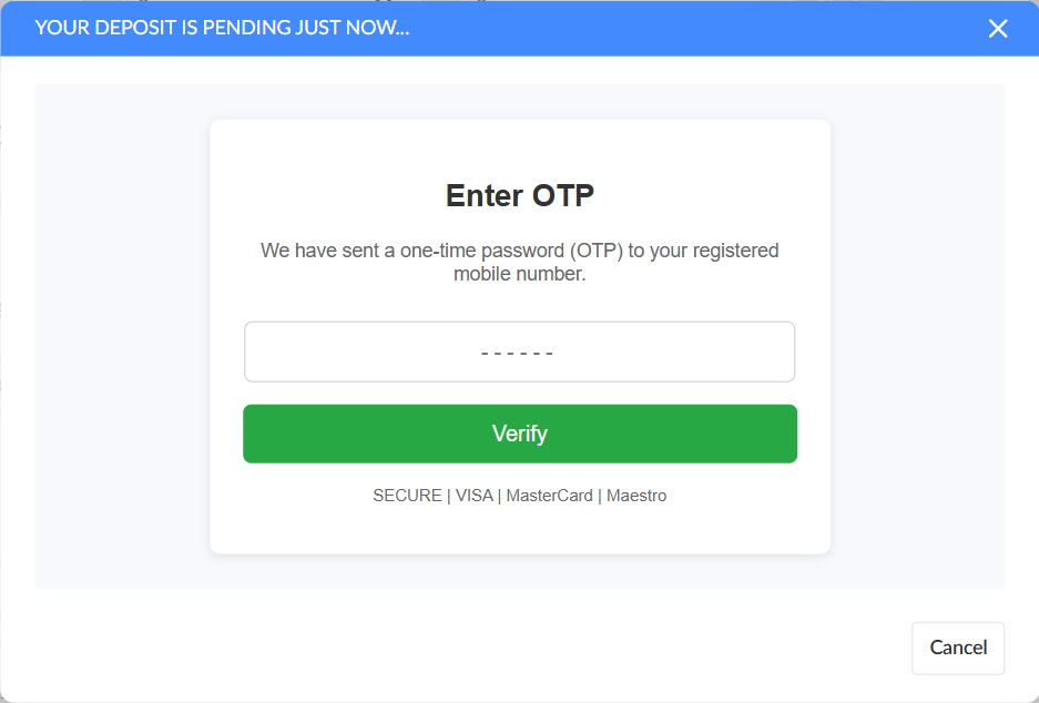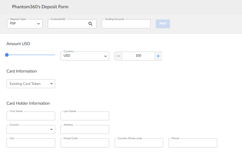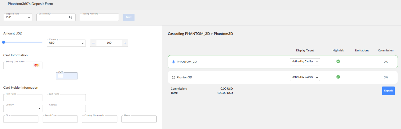 The deposit form enables back-office agents to process deposits on behalf of the brand's customers.