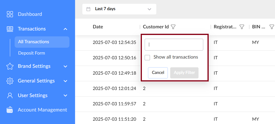 You can also filter transactions by Customer ID. Cashier displays all lifetime transactions when the ‘Customer ID’ filter is applied and ‘Show all transactions’ is selected.