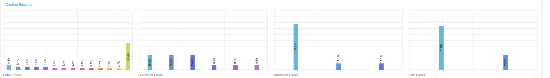 - Decline reasons: The system generates a list of decline reasons based on the current filter settings and shows the top reasons as percentages. The "other" section displays less common decline reasons.