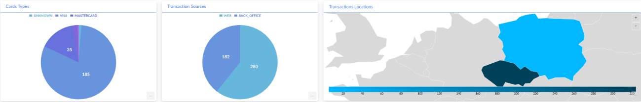 - Transaction sources: A pie chart displaying the number of transactions by source (back-office, website, mobile web, mobile app).