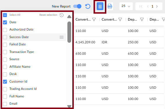 - Deposit type: A dropdown list with the following options: All (default), FTD, and STD.
